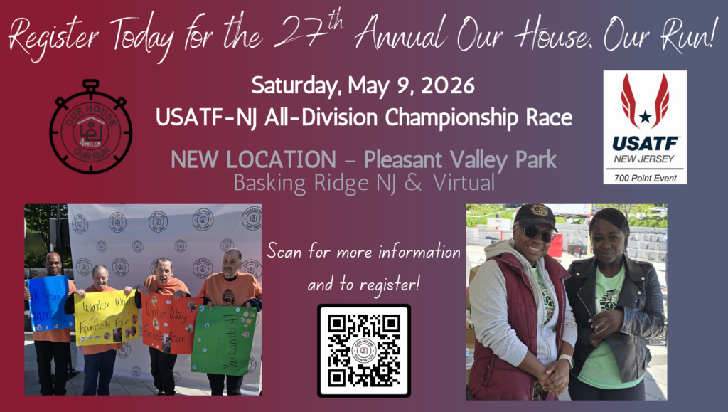 Our House, Our Run 4 Miler & Our House, Our Walk returns for our 27th anniversary celebration on May 9, 2026 at a NEW location – Pleasant Valley Park in Basking Ridge.